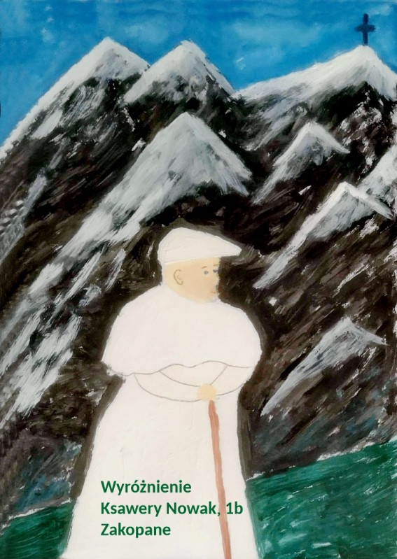 - II miejsce: Zuzanna Słoma, klasa 6b (za ekspresyjne i symboliczne ujęcie myśli papieża o pielgrzymkach po całym świecie przywołanych pośród ukochanych polskich gór)