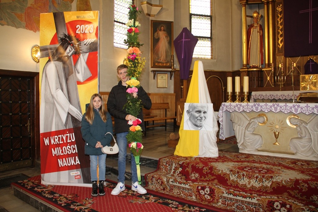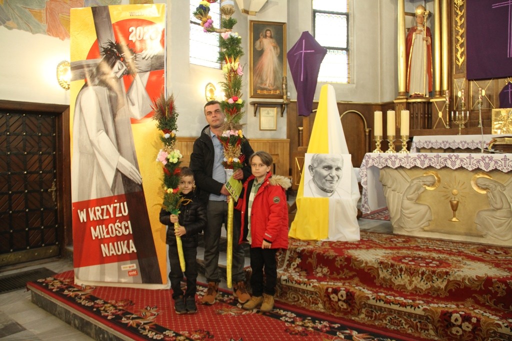 W Wielki Tydzień weszliśmy z palmami w rękach. Jednak od niepamiętnych czasów musieliśmy pozostać w kościele ze względu na deszczową pogodę. Poza tym nic więcej nie zakłóciło przebiegu uroczystości. Była nawet procesja z palmami w skróconej formie w wnętrzu kościoła. Po Mszy świętej odbył się konkurs na najpiękniejsze palmy wykonane własnoręcznie. Jak co roku było na co popatrzeć. Najpiękniejsze i największe palmy zostały nagrodzone. Najczęściej w rękach trzymały je dzieci, ale w ich przygotowanie zaangażowane było wiele osób. Cieszy fakt, że tradycja robienia palm jest przekazywana i podtrzymywana w rodzinach. W tym roku Niedziela Palmowa to także rocznica odejścia do Domu Ojca św. Jana Pawła II. Modliliśmy się za przyczyną Świętego Papieża. Wieczorem nasza świątynia wypełniła się modlitwą i wspomnieniem Jana Pawła II. Wsłuchaliśmy się w Jego słowa wypowiedziane do Polaków w czasie pielgrzymek do Ojczyzny i prosiliśmy o wstawiennictwo u Boga. Tradycją naszej parafii stało się oświetlanie ulicy Jana Pawła II w dniach z Nim związanych. Kiedyś był to dzień wyboru na Stolicę Piotrową. Teraz to rocznica śmierci albo liturgiczne wspomnienie 22 października. Tak było również w ten niedzielny wieczór. Jadąc przez Ryczów można było podziwiać bogato oświetloną lampionami ulicę Jana Pawła II. Dziękujemy wszystkim, którzy się w to zaangażowali.