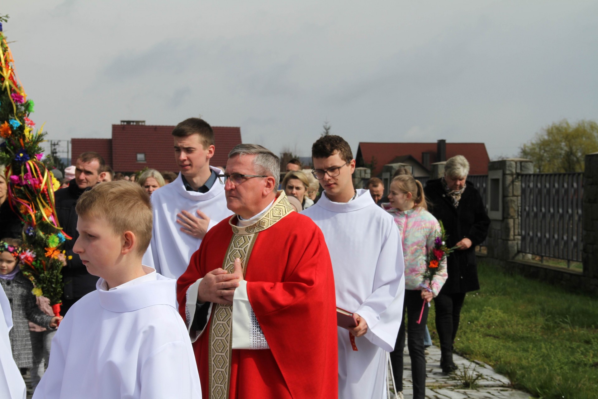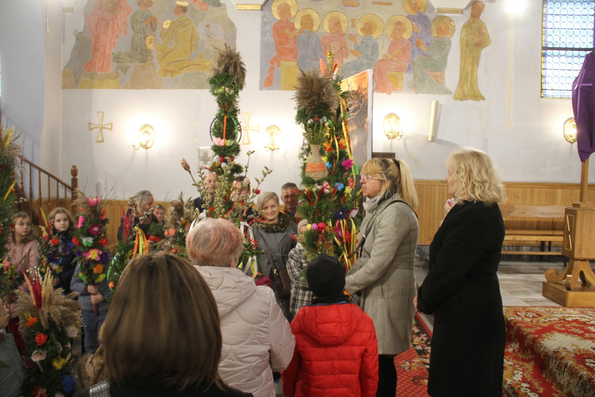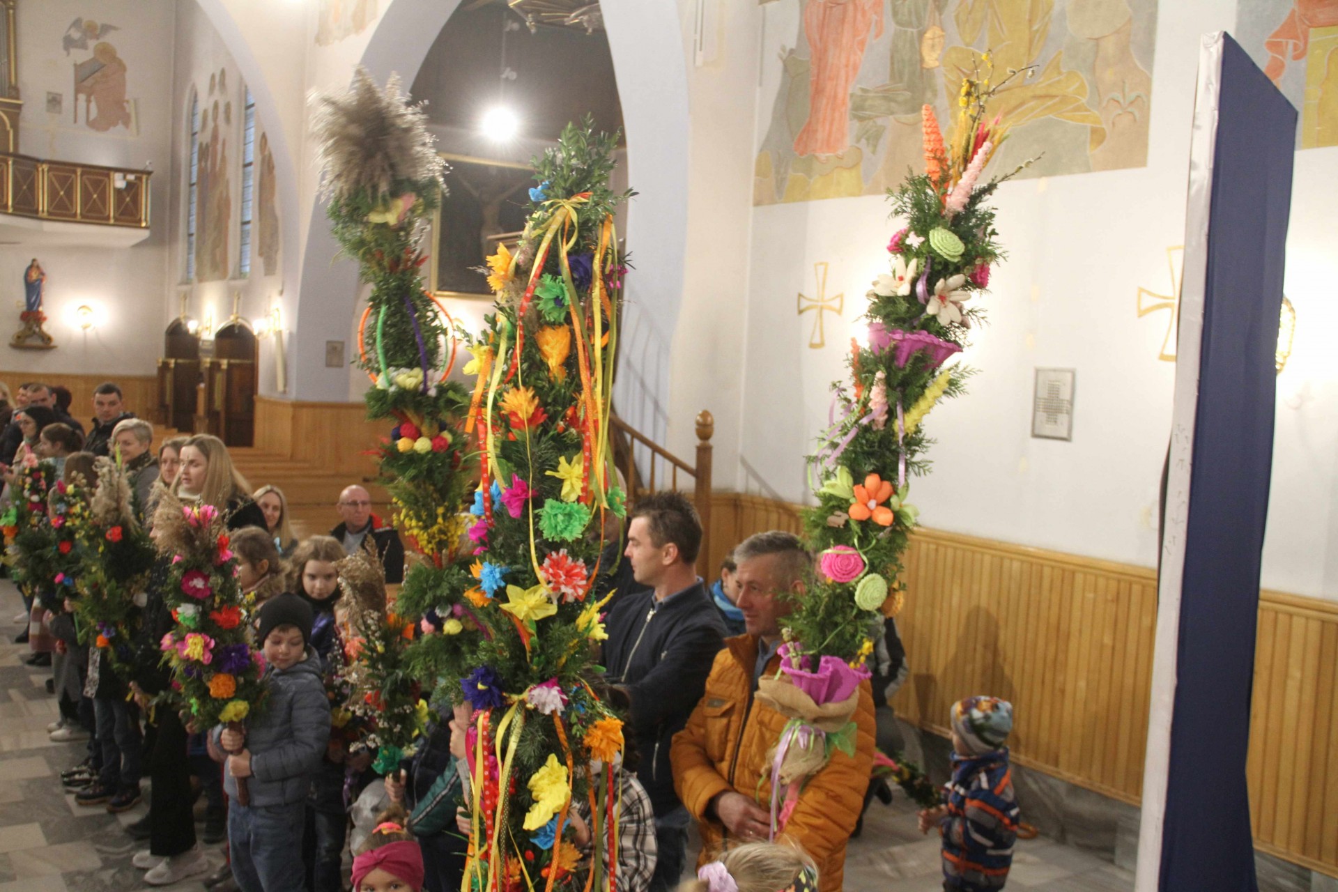 Centralnym wydarzeniem tego dnia było poświęcenie palm i procesja wokół kościoła. Przy dość zmiennej pogodzie udało nam się tego dokonać. Potem Msza święta z czytaniem opisu męki Pańskiej według św. Marka. Po Mszy świętej odbył się konkurs na najpiękniejszą palmę wykonaną własnoręcznie. Zwykle odbywał się poza kościołem przy figurze Matki Bożej, ale zmienna pogoda skłoniła nas do pozostania w kościele. Warto wspomnieć, że większość palm przyniesionych do kościoła była domowej roboty. Jury konkursowe sprawnie dokonało oceny i wręczono nagrody. Wszystkim uczestnikom dziękujemy za udział w konkursie, za trud przygotowania palm, które co roku są pomysłowo komponowane.
