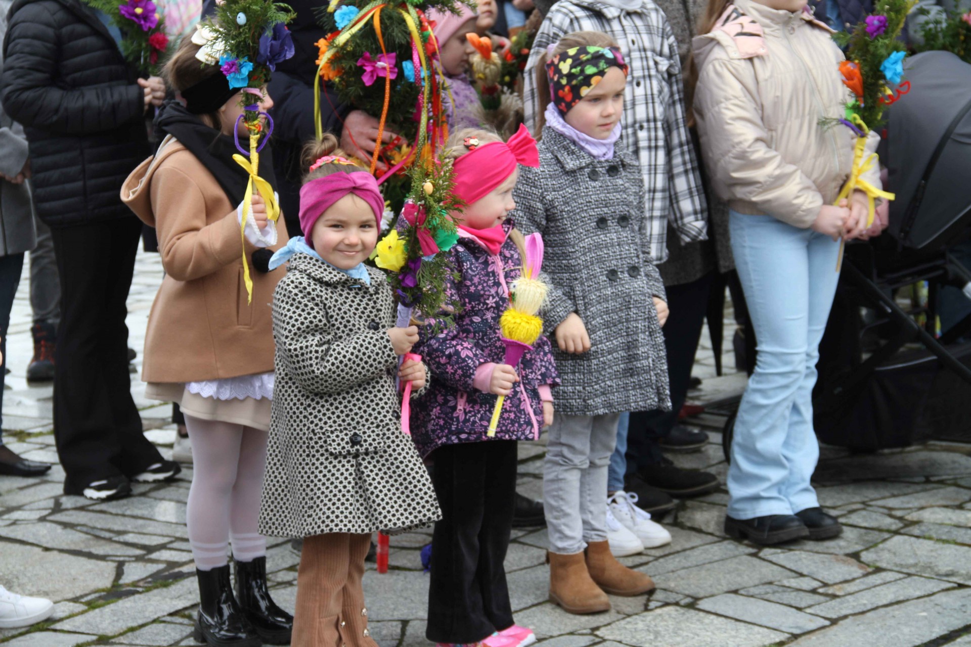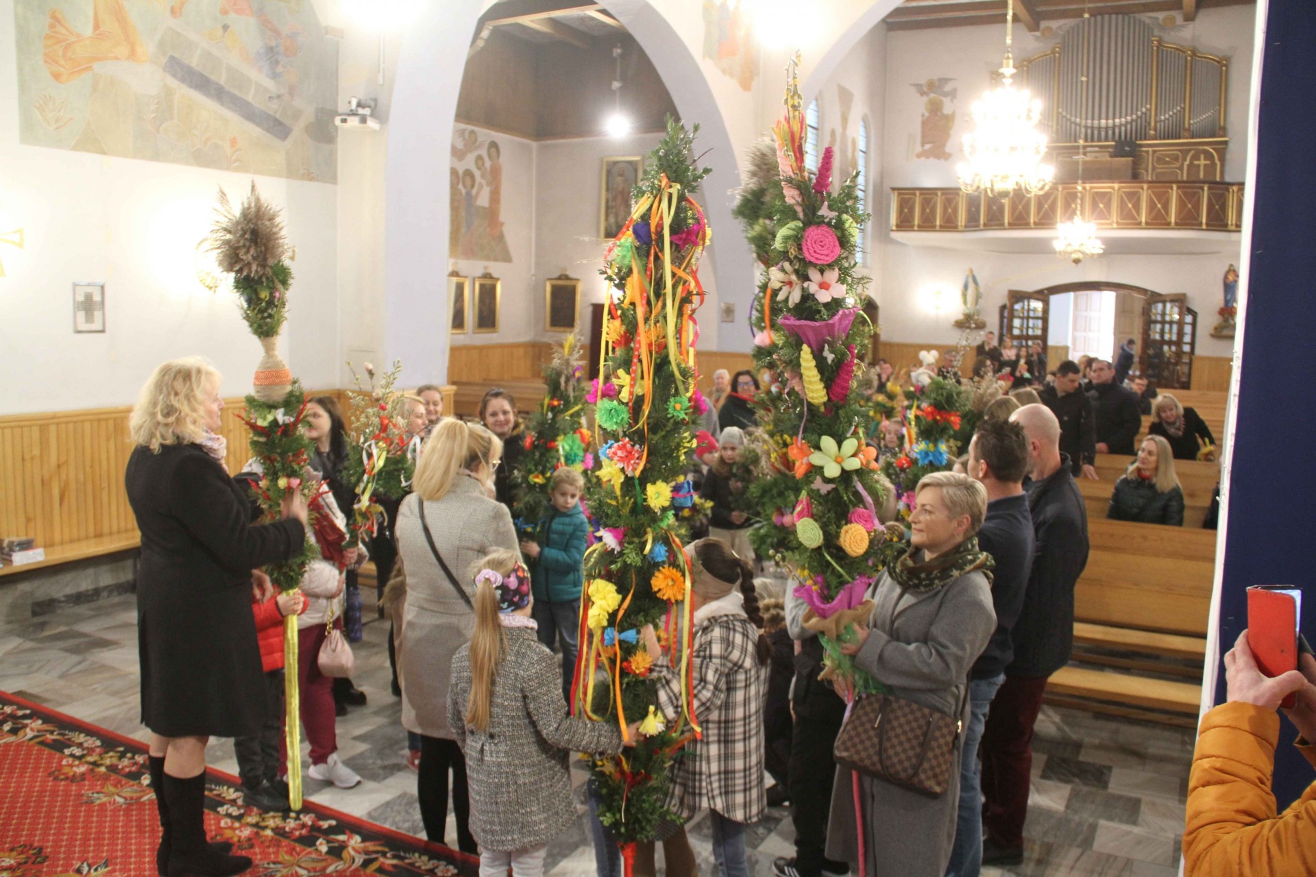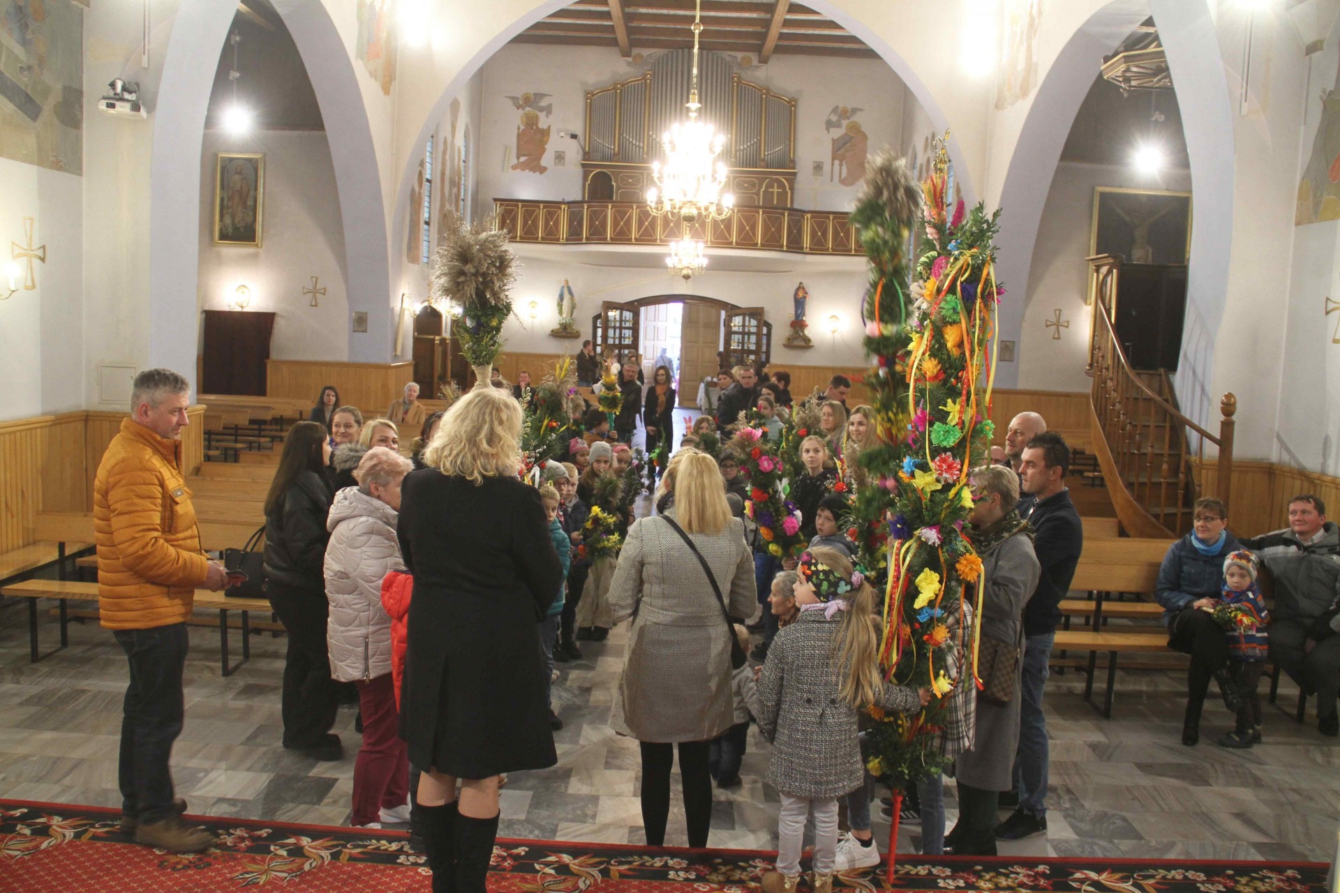 Centralnym wydarzeniem tego dnia było poświęcenie palm i procesja wokół kościoła. Przy dość zmiennej pogodzie udało nam się tego dokonać. Potem Msza święta z czytaniem opisu męki Pańskiej według św. Marka. Po Mszy świętej odbył się konkurs na najpiękniejszą palmę wykonaną własnoręcznie. Zwykle odbywał się poza kościołem przy figurze Matki Bożej, ale zmienna pogoda skłoniła nas do pozostania w kościele. Warto wspomnieć, że większość palm przyniesionych do kościoła była domowej roboty. Jury konkursowe sprawnie dokonało oceny i wręczono nagrody. Wszystkim uczestnikom dziękujemy za udział w konkursie, za trud przygotowania palm, które co roku są pomysłowo komponowane.