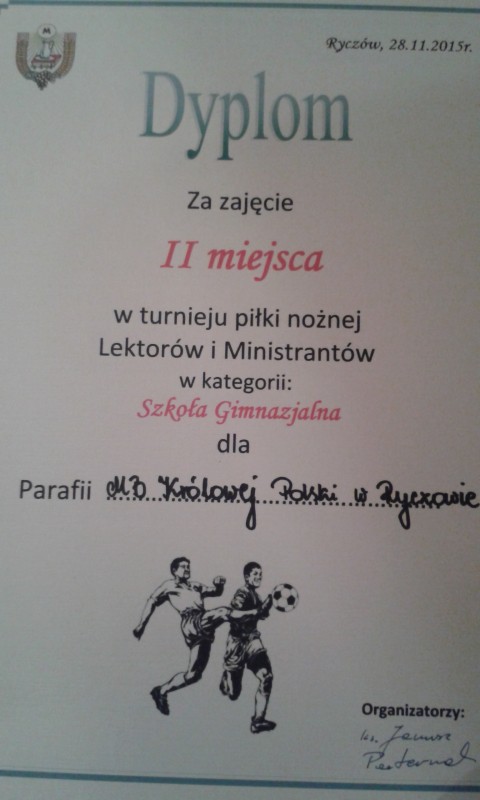 W ostatnią sobotę listopada hala sportowa naszej szkoły niemal wypełniła się ministrantami z parafii naszego dekanatu. Zmagania odbywały się w 3 kategoriach wiekowych: szkoła podstawowa, gimnazjum i szkoła ponadgimnazjalna. Zwycięskie drużyny zakwalifikowały się do etapu diecezjalnego, aby tak walczyć o reprezentowanie w finałach ogólnopolskich. Drużyny naszej parafii zajęły II miejsca w kategoriach gimnazjum i szkoła ponadgimnazjalna. Zwycięscy to: szkoła podstawowa- Zator; szkoła gimnazjalna - Przeciszów; szkoła ponadgimnazjalna- Spytkowice. Gratulujemy i życzymy sukcesów w dalszych etapach turnieju!