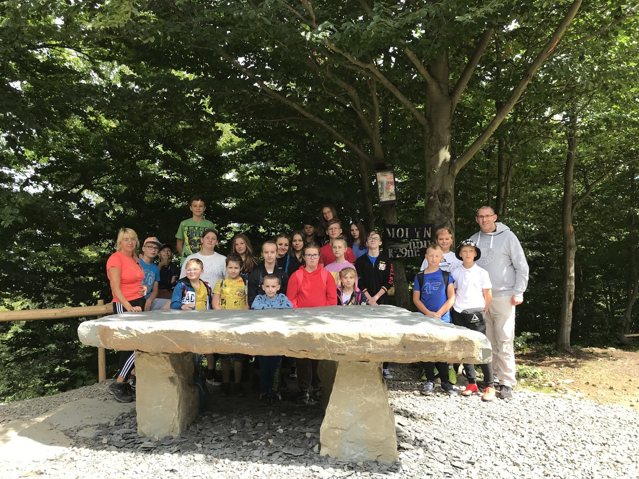 Głównym celem naszej wycieczki była wędrówka, uczciwie trzeba przyznać, że niezbyt ambitna, na górę Modyń w Beskidzie Wyspowym. Modyń w ostatnim czasie przyciąga coraz więcej turystów ponieważ nie jest zbyt wymagającym szczytem, a w ostatnie wakacje postawiono tam wieżę widokową, z której rozciągają się piękne widoki na wszystkie okoliczne góry z Tatrami włącznie. My wybraliśmy najkrótszy szlak prowadzący na Modyń z Młyńczysk. Droga upłynęła nam na sympatycznych rozmowach i wzdychaniu, że wakacje są tak krótkie.